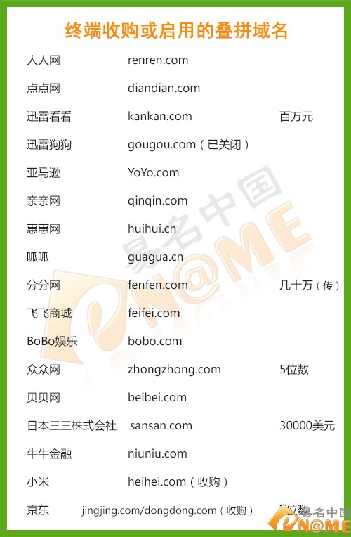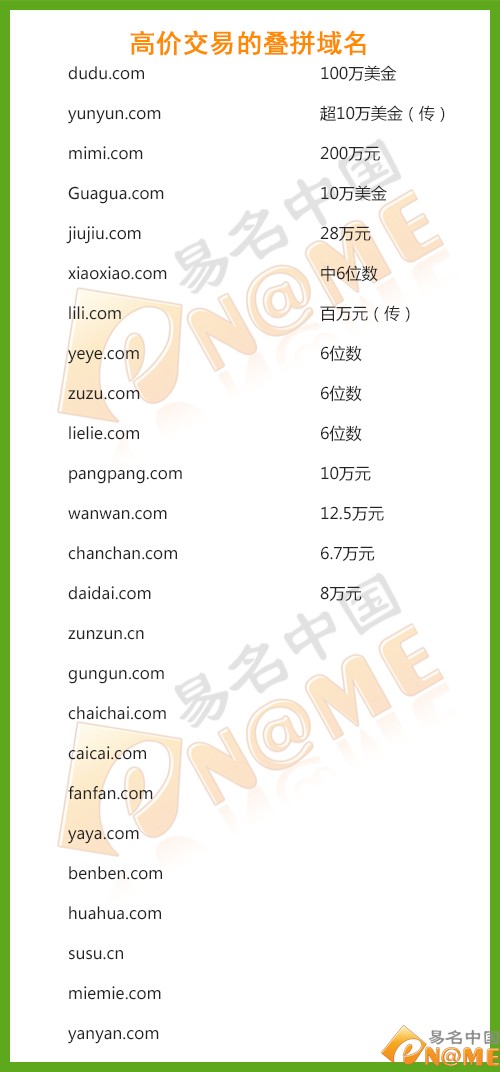 在域名交易市場(chǎng)中,疊拼域名的行情一向被看好。域名dudu.com就曾于2012年年初以100萬(wàn)美金的價(jià)格結(jié)拍,位居當(dāng)周Sedo榜單第一名。當(dāng)時(shí)的買家為海外知名社交網(wǎng)站DUDU,賣家則是千橡集團(tuán)的陳一舟。