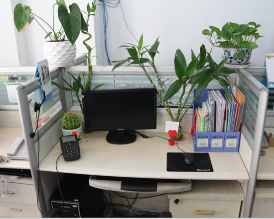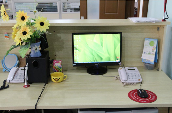 賞析:大家現(xiàn)在看到的是【第二名:“最有變化獎”】得主續(xù)簽部經(jīng)理劉清華的工位。首先看到的是個性而向上的激勵語,電腦屏幕上寫著“我不怕千萬人的阻擋,只怕我自己投降”一句話正好印證了工位主人的處事及追求,再加上手機、電話和文竹,這正是:“文竹節(jié)節(jié)攀新高,手機電話愛客戶;天天能進萬千金,你說知足不知足?”