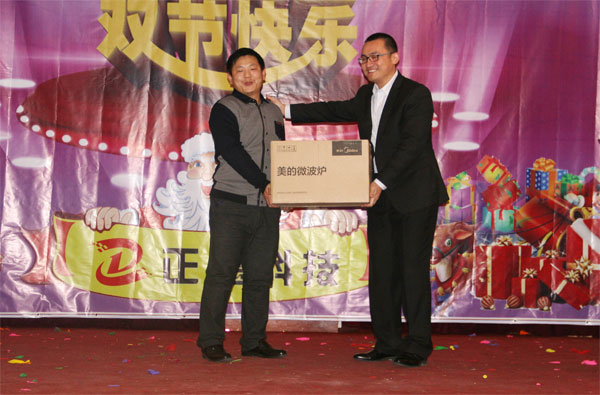 張總(右)為征文比賽一等獎得主杜海濤(左)頒獎